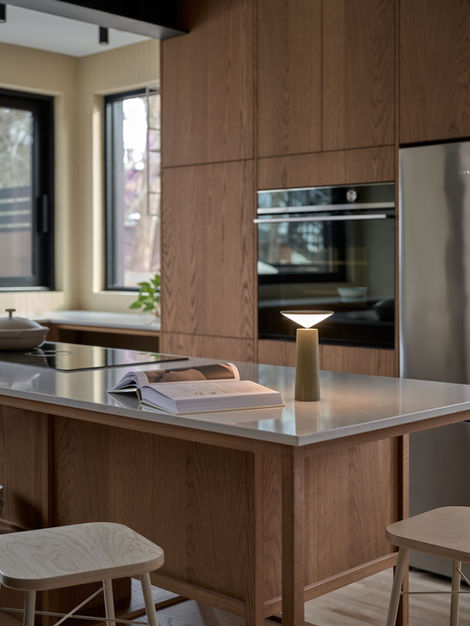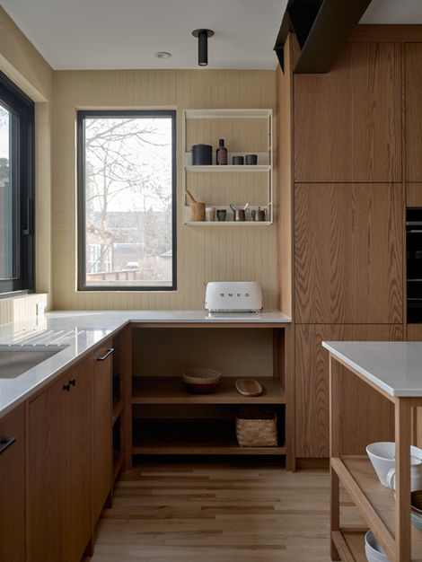 Un projet d’agrandissement sur lequel nous avons beaucoup travaillé afin d’optimiser chaque petit détail. Le résultat? Un espace lumineux, chaleureux et totalement réinventé où chaque élément trouve parfaitement sa place. La teinte du bois, la cuisine sur pattes, les murs de céramique, les poutres exposées, les grandes fenêtres, tout a été longuement réfléchi.